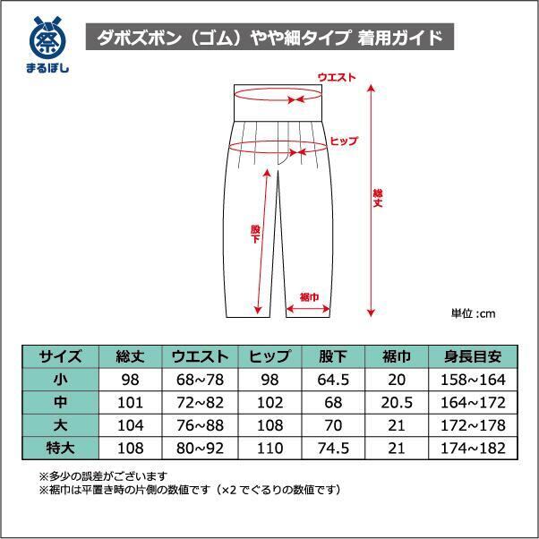 お祭りやお太鼓などで着用するお祭り衣装のウェストゴムタイプです。ダボズボン、ダボ下、ストレート等と呼ばれるお祭りズボンで、ピッタリ履きこなす股引とは対照的に、ゆったりと履きこなします。足さばきの良さと脱ぎ履きのし易さが特徴の商品です。