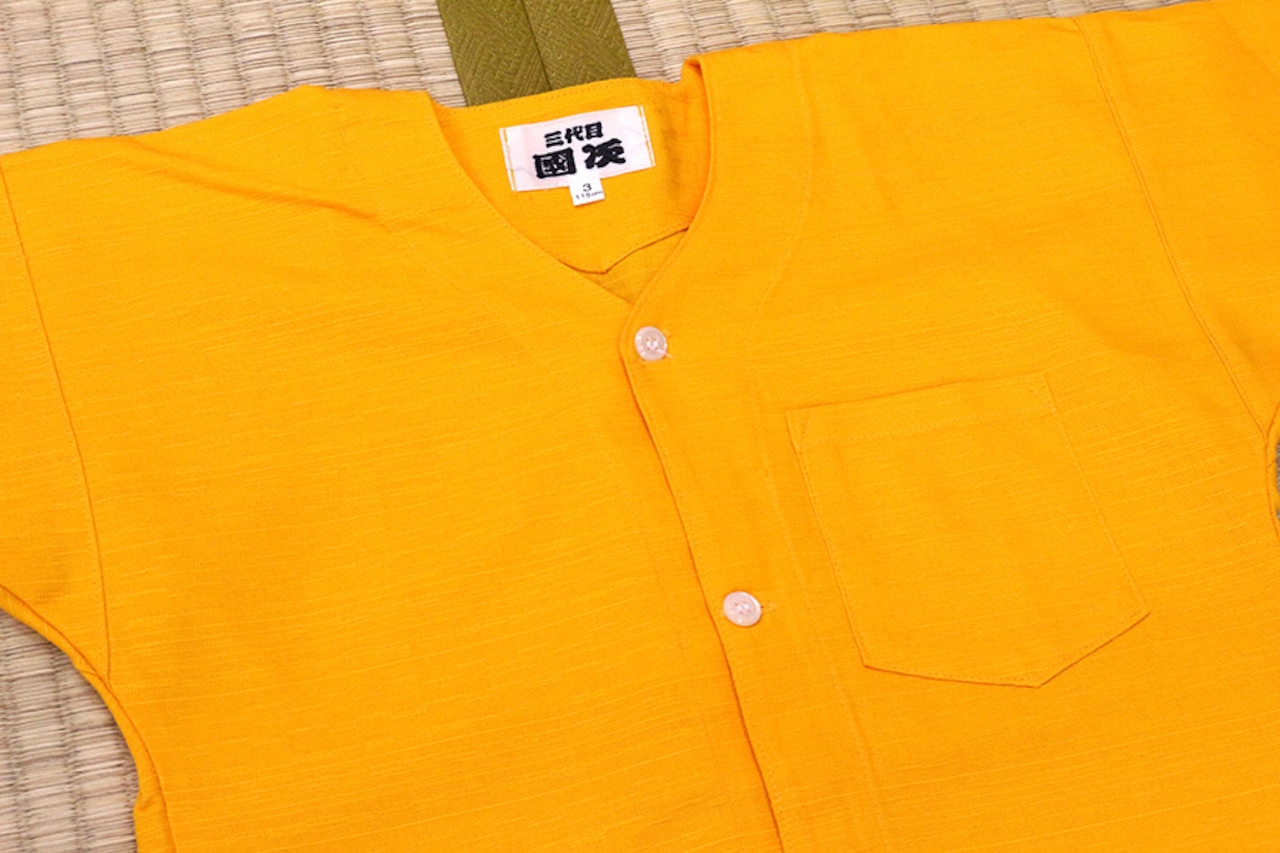 ★処分特価★カラー綿紬 子供鯉口シャツ 黄色 1号~7号(95cm~145cm)★男女兼用 七分袖 イエロー キッズ 三代目國次