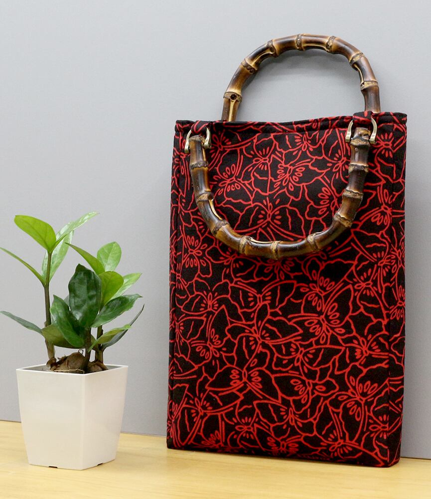 手ぬぐい生地 バンブー 手提げバッグ 蝶 黒赤色★竹手バッグ お祭り 丸星 日本製 B30